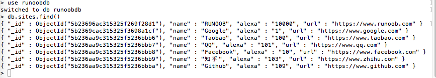 { "_id": 1, "name": "RUNOOB", "cn_name": "菜鸟教程"},